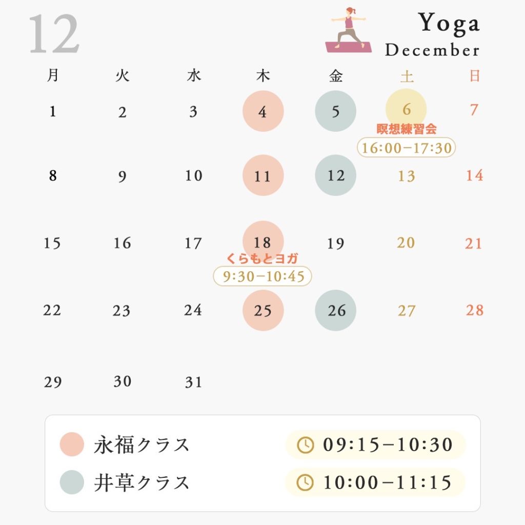 | 参加費 | 【永福・井草クラス】 【週末クラス】 予約は予約サイトからお願いいたします。 〈キャンセルについて〉 |