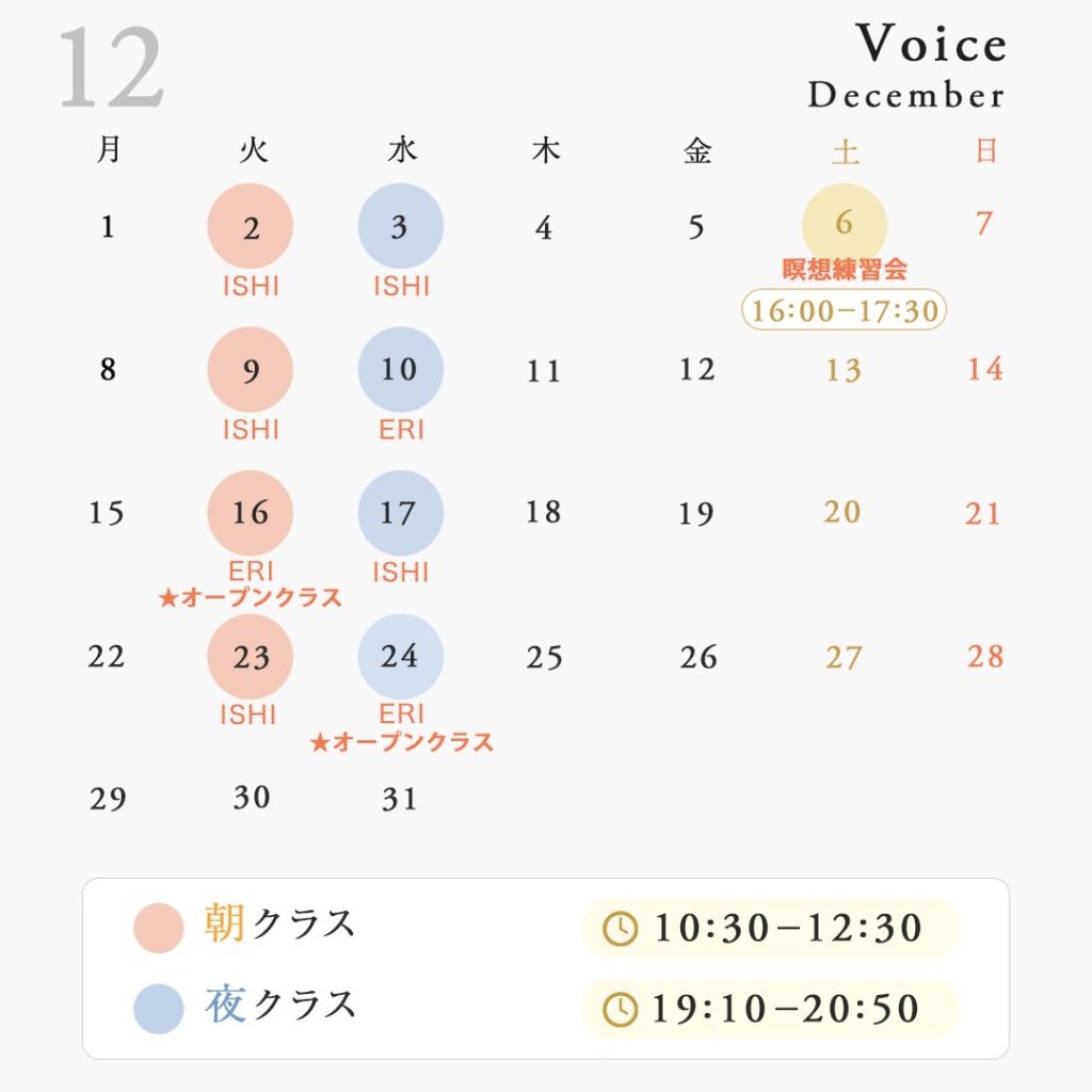 | 参加費 | 【朝クラス】【夜クラス】 *入会金 6,600円 1回 3,000円 / 6回券 16,500円 (初回受講月から6ヶ月間有効)※ 6回券は会員のみ購入可能/事前一括払いのみ 【オープンクラス】 *入会金なし 1回 2,750円 (回数券使用可)(〜2025年12月) ※2026年1月より3,000円に変更させていただきます。 〈前日18時以降にキャンセルされた場合〉キャンセル料として、レッスン料の全額をご負担いただきます。ご了承ください。 ※2026年より、クラス12時間前まで、キャンセル可能といたします。 |